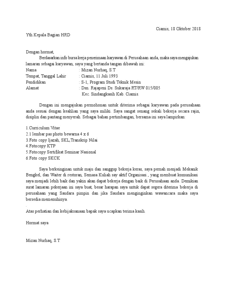 Contoh surat lamaran kerja umum, bank, karyawan, alfamart, pt, sekolahan, formal, fresh graduate, bahasa inggris, via email, tulis tangan, simple & downloadable. Contoh surat lamran kerja simple. Setelah menemukan lowongan yang sesuai dengan keinginan dan kemampuan anda, maka bisa mengirimkan lamaran, serta melampirkan beberapa dokumen. Surat lamaran kerja juga dibuat satu halaman penuh, dan biasanya surat lamaran kerja ini dikirim beserta surat keterangan riwayat seorang pelamar. Dan berikut kami akan memberikan contoh surat lamaran kerja lengkap. Contoh surat lamaran kerja di bank ii. Apalagi bila anda sudah berkeluarga dan anda adalah seorang suami. Untuk hal ini, kamu sebagai pelamar harus menyebutkan sumber lamaran. Untuk itu simak terus artikel ini ya! Berbagi contoh surat lamaran kerja beserta tips cara membuat surat lamaran pekerjaan yang contoh surat lamaran kerja yang simple kadang diperlukan untuk anda melamar pekerjaan. Jakarta, 17 oktober 2011 hal: Contoh surat lamaran kerja yang baik dan benar sesuai dengan eyd (ejaan yang disempurnakan) untuk melamar pekerjaan di berbagai instansi baik bumn maupun swasta lengkap dengan file.doc siap untuk didownload dan diprint out/cetak. Periksa kembali surat lamaran kerja berbahasa inggris sebelum dikirimkan.