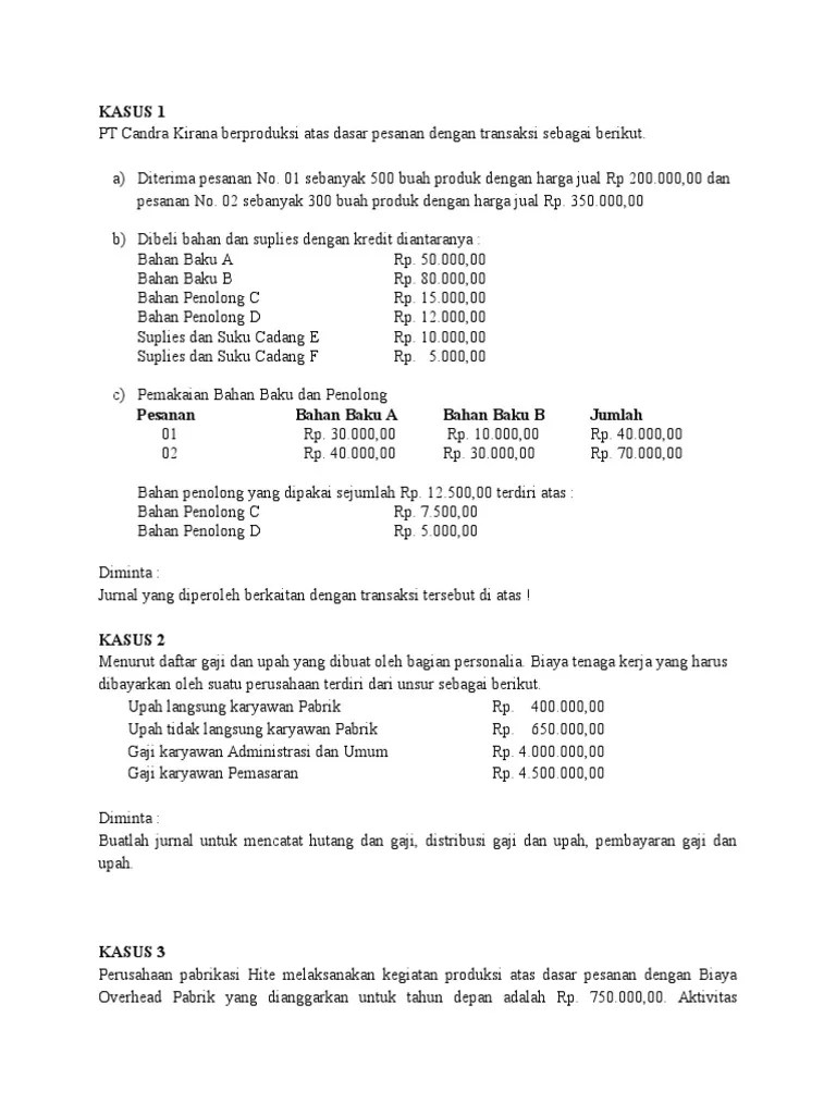 Biaya yang disingkat dengan bop ini digunakan untuk menyatakan beberapa biaya tidak langsung yang terkait … Bagaimana penggolongan, penentuan tarif, pembebanan, pengumpulan, cara menghitung biaya overhead pabrik dan perlakuan … 24/07/2020 · dalam perhitungan harga pokok, biaya overhead pabrik yang terjadi sangat sulit untuk secara langsung dibebankan kepada produk. 29/10/2021 · biaya overhead pabrik (factory overhead cost) adalah elemen biaya produksi menurut objek pengeluarannya. Sehingga bop yang dibebankan kepada produk biasanya atas dasar tarif biaya overhead pabrik tunggal atau tarif biaya overhead pabrik departemen. C) biaya overhead pabrik biaya ini terdiri atas biaya bahan penolong,biaya listrik, biaya tenaga kerja tidak langsung, biaya penyusutan, biaya pemeliharaan, biaya asuransi dan biaya2 lainnya diluar biaya bahan mentah dan tenaga kerja langsung. Biaya overhead dibedakan menjadi 3 jenis, yaitu biaya overhead tetap, variabel, dan semi variabel. Pada poin pertama ini sifat biaya overhead adalah tetap dan umumnya dikeluarkan. Pexels) seperti yang telah tersirat lewat beberapa penjelasan di atas, biaya overhead terdiri dari pengeluaran perusahaan secara umum yang tidak Untuk menghitung besarnya harga pokok produksi yang didasarkan komponen2 di atas perlu adanya penetapan dan perkiraan produksi dalam satu tahun. Untuk lebih jelasnya berikut merupakan penjelasannya. Biaya overhead pabrik disebut juga biaya konversi (conversion cost), yaitu biaya untuk mengkonversi (mengubah) bahan baku menjadi produk jadi. Biaya sewa dan pemeliharaan kantor merupakan salah satu contoh biaya overhead (sumber: